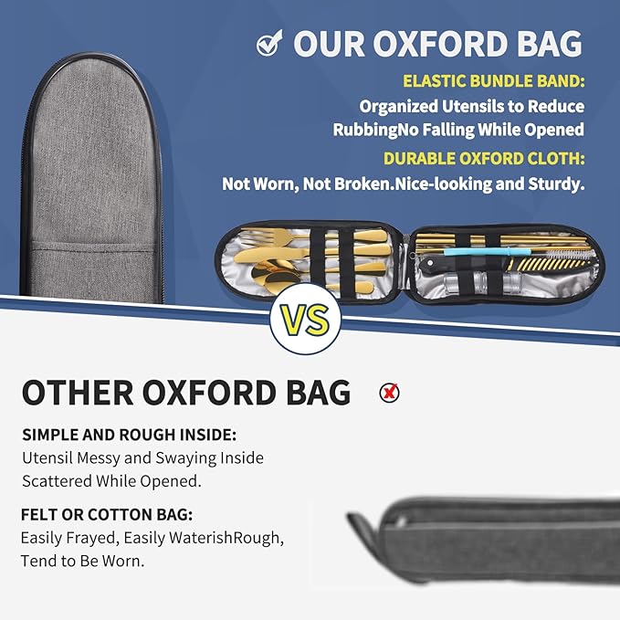 - The 10-Piece Travel Camping Cutlery Set:an zipper-case with a set of eating basis of a dinner fork, a dinner knife, a dinner spoon a tea spoon and a special included sheathed steak knife, two mini spice jars ,chopsticks, cleaning brush, and straight straw with silicone tips. The elastic bundle bands inside help to organize utensils stay good in the bag and avoid messy and falling while zipper opened.travel utensils with case