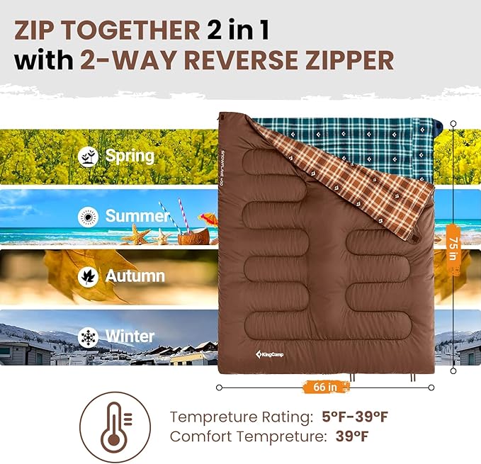 - MULTIFUNCTIONAL DESIGN-More Than Just a Sleeping Bag: This versatile sleeping bag offers more than just a place to sleep! The 2-way zippers allow you to zip two sleeping bags together for couples or family camping. Unzip the bottom for extra ventilation to cool your feet on warmer nights. Not only can it be used as a sleeping bag, but it can also be transformed into a blanket or picnic mat for family trips. Plus, it's machine washable, making cleaning a breeze for frequent use.