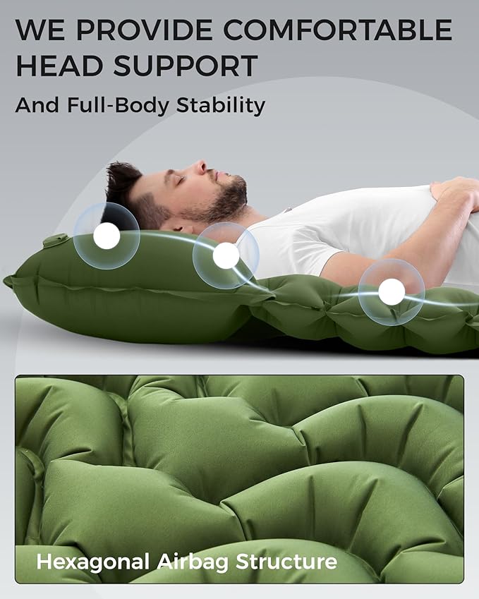 - ERGONMIC DESIGN: Experience ultimate comfort with our water ripple styled camping sleeping pad, complete with an inflatable pillow that conforms to body mapping technology. The strip column design enhances support and uniformly distributes stress for a comfortable night's sleep.