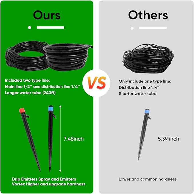 - Upgrade Tubing Design: We upgrade the main tubing into 1/2" diameter to support a high-water pressure. The long 40FT main tubing can be cut into 2 main tubes and we offer 2 faucet connectors in the package to make you can easily build up 2 set drip irrigation systems if you need.
