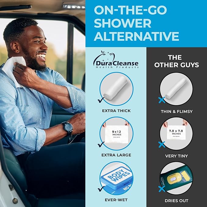- Effective Cleaning: Our jumbo-sized, no-rinse bathing wipes are the ultimate solution for on-the-go cleansing! These extra moist body cleaning wipes gently but thoroughly lift and remove dirt, sweat, grease, and grime without stripping your skin's moisture. Safe to use in outdoor settings and microwaveable for a warm, luxurious clean. No sticky residues. Say goodbye to soap and water, and hello to clean, refreshed skin with our on-the-go waterless shower wipes.