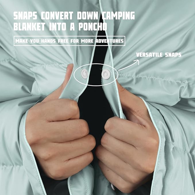 - PRODUCT DETAILS: There are snaps on the side of the down blanket to better fit it in place, and thus the blanket could be used as a poncho, cloak or a emergency blanket