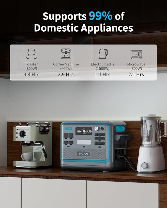 - 【FULL CHARGE IN 1.8 HOURS】Compare with other power station, Ecoplay 2400w power station adopts the most advanced bidirectional inverter technique with an AC input up to 1100W. it can be fully charged in 1.8 hours with AC adapter (included). It takes just 1.5 hours to fully charge with an AC outlet and Solar panel(500W) simultaneously. It takes 7 hours with solar panel(400W).17 hours with car charging.