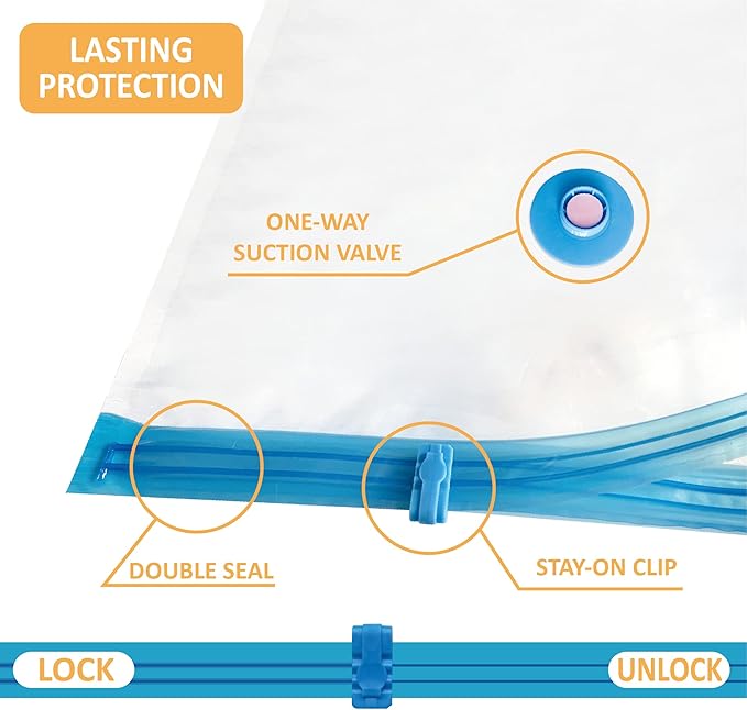 - Reliable protection: With the triple-seal turbo valve & double-zip seal design, our vacuum bags get the air out in the suction process. Can be used repeatedly.