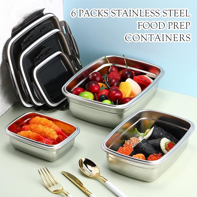 Nuanchu 6 Packs Stainless Steel Food Storage Containers Airtight Metal Food Containers Meal Prep Container Leak Proof Stackable Bento Lunch Box with Lids for Kitchen Travel Picnic and Camping(Black)