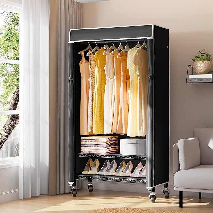 VIPEK R3C Rolling Clothes Rack with Cover Portable Closet for Hanging Clothes, Heavy Duty Garment Rack Freestanding Clothing Racks with Wheels& Hanging Rod, Black Closet Racks with Black Cover