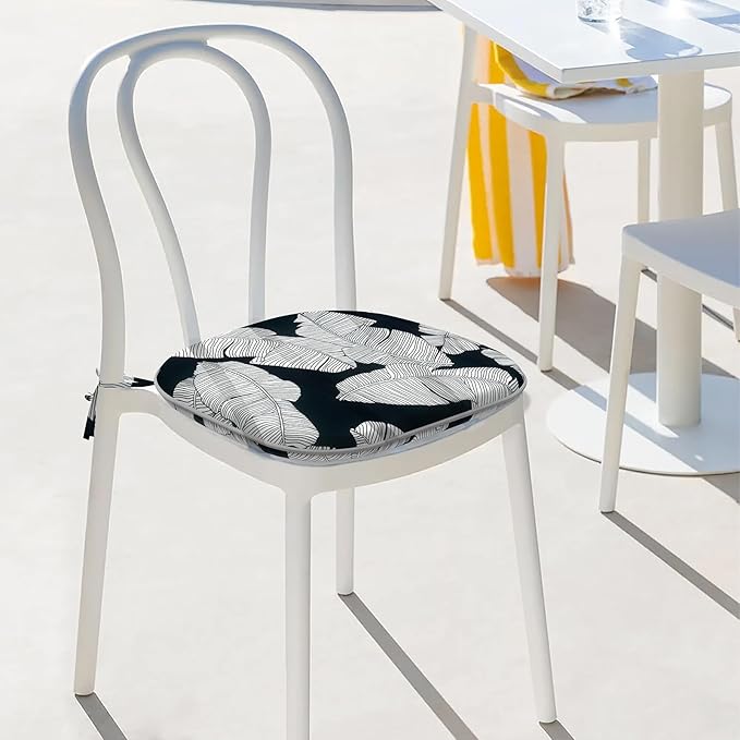 Indoor/Outdoor Chair Cushions 16x17 Inch, Patio Chair Cushions with Ties, All Weather Seat Cushions for Patio Furniture Home Garden Chair Use, Set of 4, Black Lush Leaves