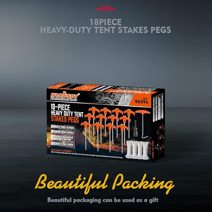 HORUSDY Tent Stakes Heavy Duty, 18-Pack 8.07 Inch Tent Stakes with with 4x13ft Rope & 1 Stopper T Pull Hook