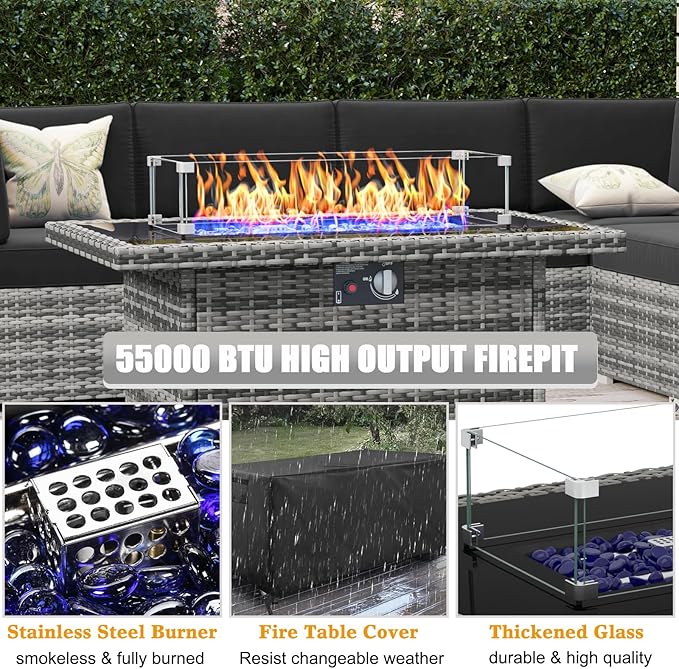 - 55000 BTU FIRE PIT TABLE: Using a dual-tube stainless steel burner, the heat output is 55,000 BTU after ignition, which keeps stable and fully burned, providing sufficient warmth. Propane fuel allows you to no longer suffer from ash and smoke.
