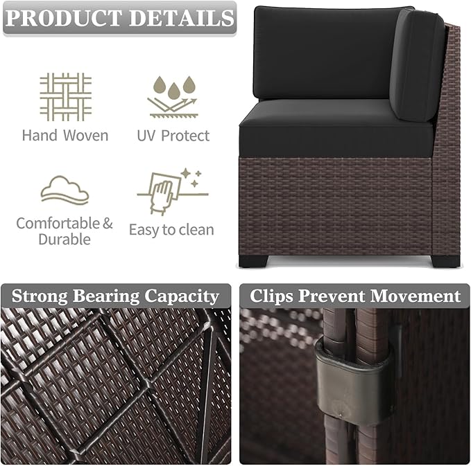 - FLEXIBLE COMBINATION SETTING: 13 pieces outdoor furniture sets come with 4 x Corner Sofas, 6 x Single Sofas, 1 x Fire Pit Table, and 2 x Coffee Table. It allows being pieced together in any combination to suit your needs and match your space