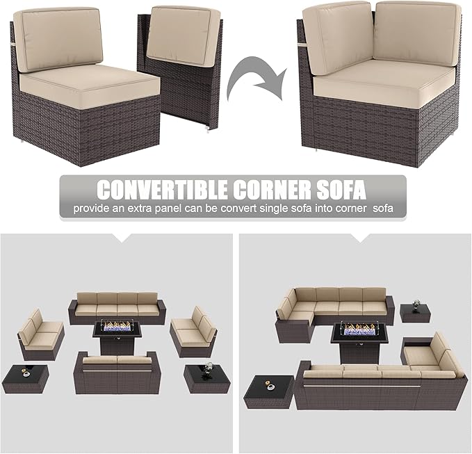 - FLEXIBLE COMBINATION SETTING: 13 pieces outdoor furniture sets come with 4 x Corner Sofas, 6 x Single Sofas, 1 x Fire Pit Table, and 2 x Coffee Table. It allows being pieced together in any combination to suit your needs and match your space