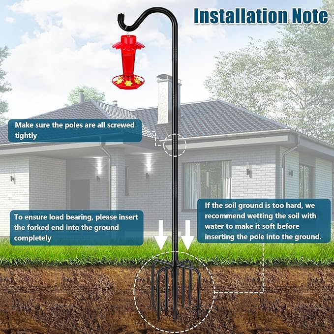 - ?�INSTALLATION NOTES?‘Please tighten each connecting rod to ensure structural stability. Shepherds hooks are suitable for soil ground, if the soil ground is too hard, we recommend wetting the soil with water to make it soft before inserting the pole into the ground. You can either step on the 7 prongs base with your foot or use a rubber hammer to insert it into the ground. To keep from damaging the 7 prongs base, please do not hit it with a metal hammer when inserting it into the ground. Please insert the forked end into the ground completely to ensure load bearing