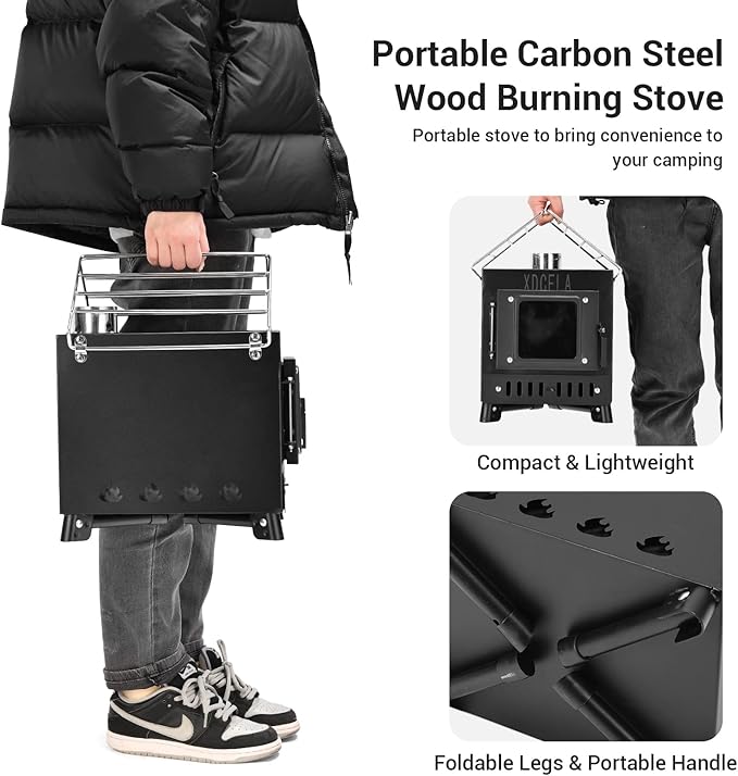 - MULTI-PURPOSE WOOD STOVE - Specially designed for outdoor. Size: Weight: , easily portable. Nothing worse than having a cold and miserable night in a tent. XDCFLA small wood burning stove can bring you a enjoyable camping life: Warm up your tent/water/food, Make coffee, Dry damp clothes etc. The expanded stand is also designed to carry or shelve clothes/foods.