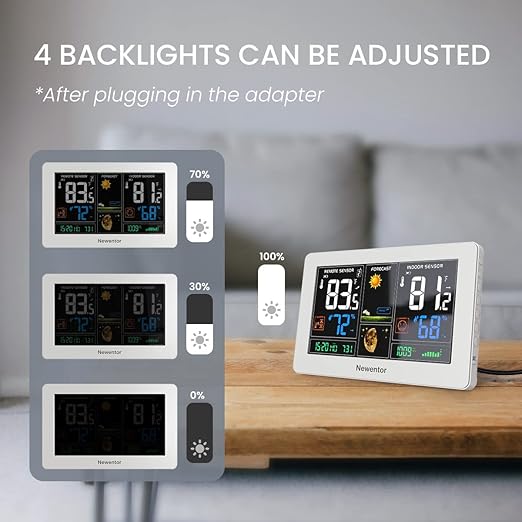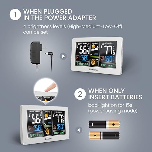 - [7.5in Large Colorful Display with Adjustable Backlight] When only insert batteries(2 X AA battery, not included), this weather clock enters the power saving mode and the backlight is on for 15S. When plugged in the power adapter, 4 levels of backlight(strong-medium-low-dim) can be adjusted (when searching for WWVB signals, to avoid some interference factors, the screen goes blank for 7 minutes).