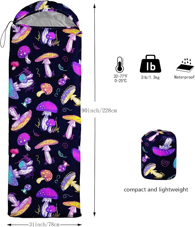 - A THOUGHT OUT DESIGN: Drawstring allows you to tighten hood and keep you warm. The idea of having a zipper at the foot to allow more warm or cool air to enter or exit the bag in different times of the season.Our Purple Mushroom sleeping bags are designed to provide much needed rest after a full day of outdoor activities.