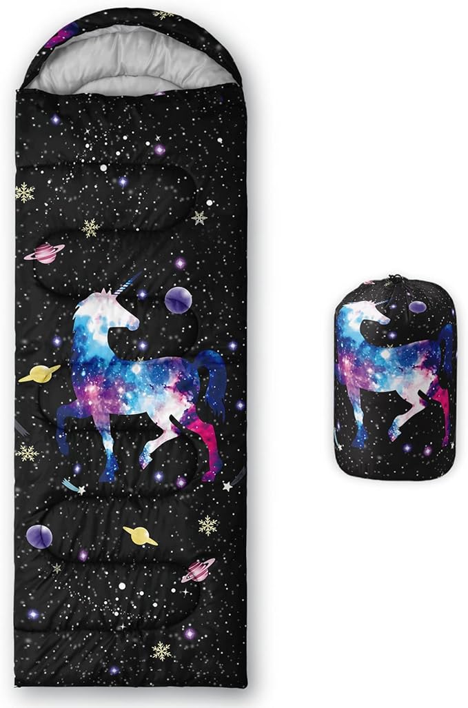 - A THOUGHT OUT DESIGN: Drawstring allows you to tighten hood and keep you warm. The idea of having a zipper at the foot to allow more warm or cool air to enter or exit the bag in different times of the season.Our Outer Space Unicorn sleeping bags are designed to provide much needed rest after a full day of outdoor activities.