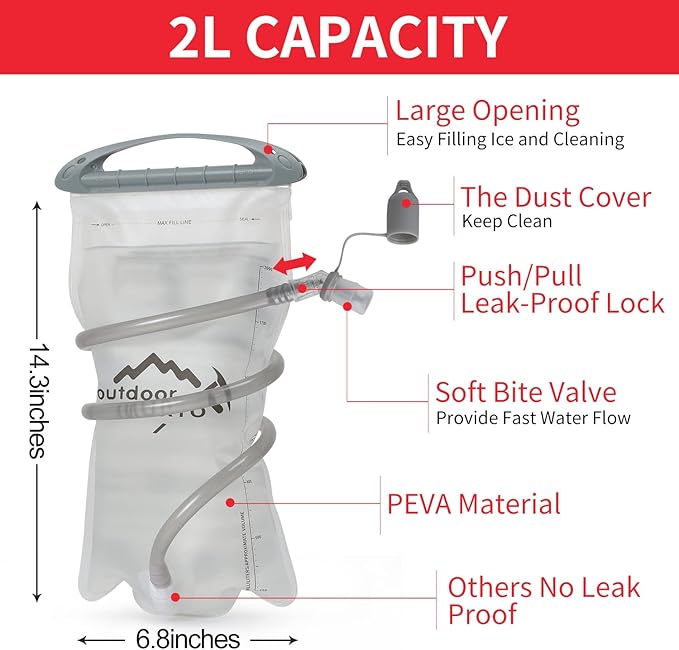 - 🚴【Premium Quality Water Bladder】The Hydration Pack Backpack comes with a 2 liter hydration water bladder and two 250ml soft flask. A switch valve and a cover cap make double leak-proof. Large opening allows quick filling of water and ice and it is easy to clean, the water line (40"length,0.4"diameter) provides a wholesome flow for easy drinking keeps your water tasting fresh, all day. The water temperature is range -20~+50℃.