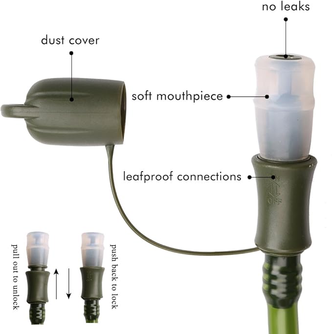 - Well-sealing water bladder: You won't be slowed down with our high flow bite-valve; simply bite the mouthpiece to suck water; soft mouthpiece with easily accessible ON/OFF valve; it also has a cover to keep dirt out; conveniently control the water flow by biting; quick-release tube is detachable; while the tube is removed, the connector automatically shut off and the hydration bladder will stay filled; store neatly in fridge/icebox without tangling hose