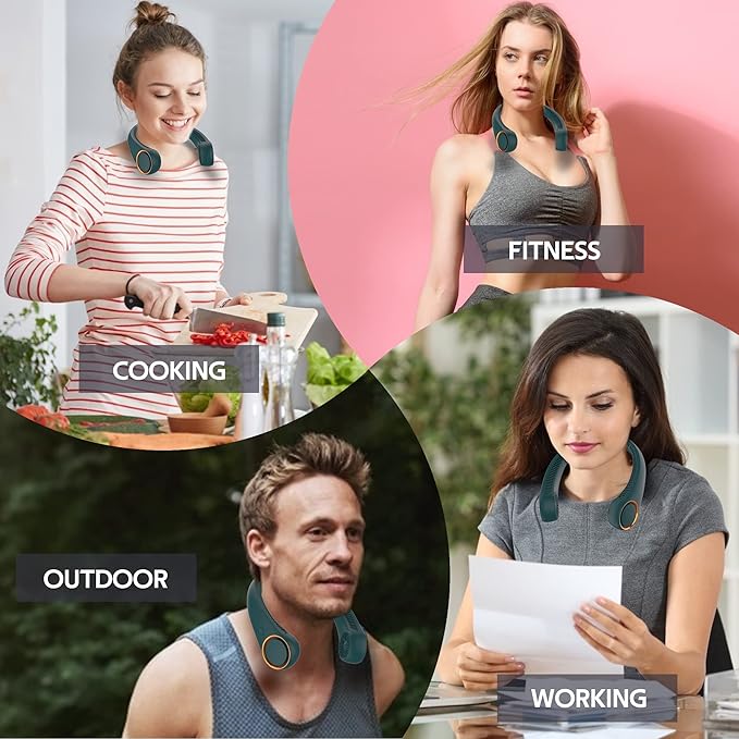 - 【Cool down quickly】Personal fan with 72 wind outlets and 60pcs twin-turbine fan blades,there are air outlets on both sides and at the rear, which can achieve a 360° omnidirectional air outlet and cooling,neck fan has three speeds to meet different needs,portable neck fan keeps you cool anywhere.
