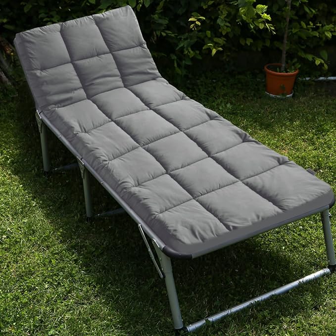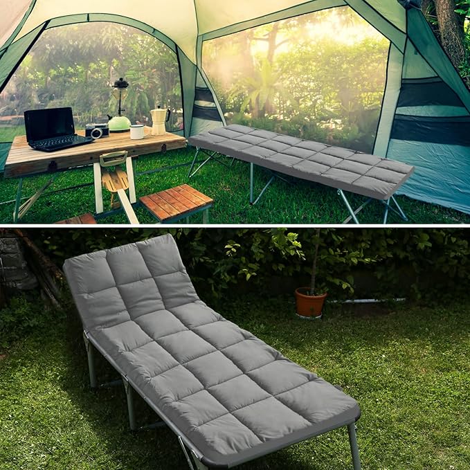 - Multiple-uses: The cot mattress topper can fit up to most camping cots, including flat cots, cots with elevated head, folding cots with pillow, lounge chaise chairs. The cot pads for camping also perfect for any outdoor activity like traveling or car camping for family, indoor use for house guest bed, floor mattress and kids play mat.