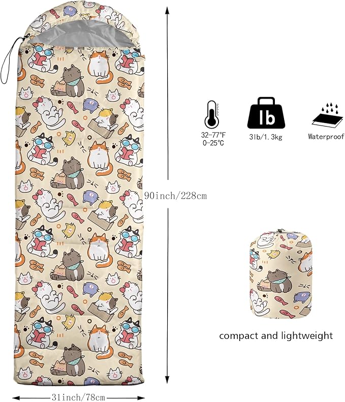 - FITS FOR 3 SEASONS: SIZE - 31 by 90 inches (W x D). Our sleeping bag can be used in 3 seasons with a design temperature of 32℉-77℉(0℃-25℃). These bags also have a weather resistant waterproof design to keep you warm and prevent you from any dampness.