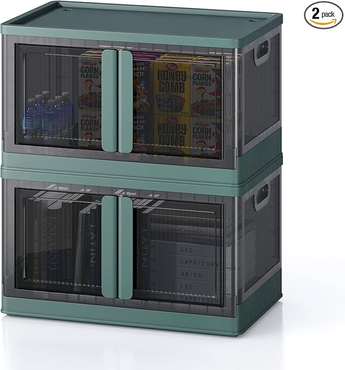 19Gal Collapsible Storage Bins with Lids & Wheels - 2 Pack Stackable with Doors, Heavy-Duty Plastic Containers for Home/Office, Green