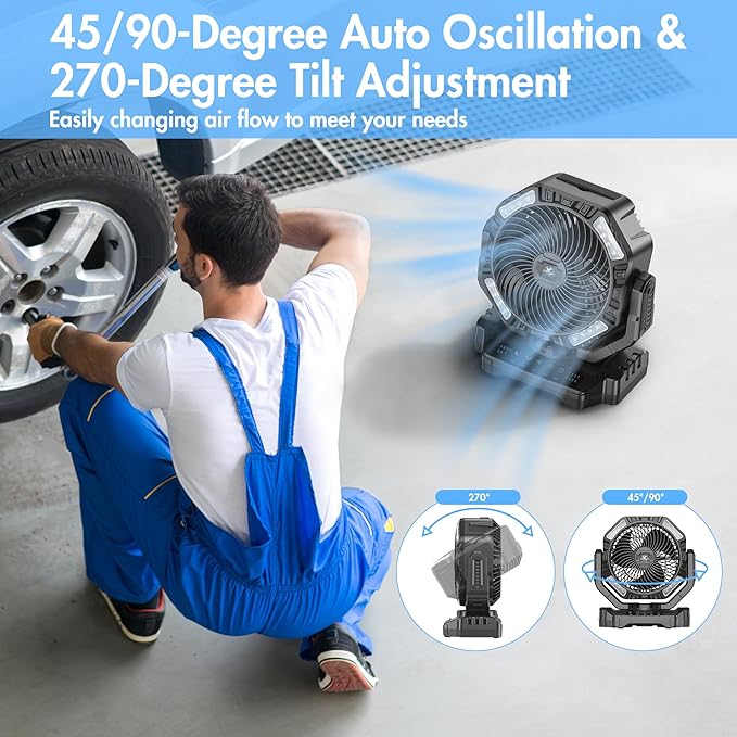 - 9-INCH TRIBLADE & AUTO OSCILLATION: The camping fan with 9-inch bionic blades that delivers powerful 16.1ft/s airflow for superior cooling. With 4 adjustable speeds to meet your needs, plus 90°/45° auto oscillation and 270° manual tilt, it provides full-directional airflow exactly where you want it