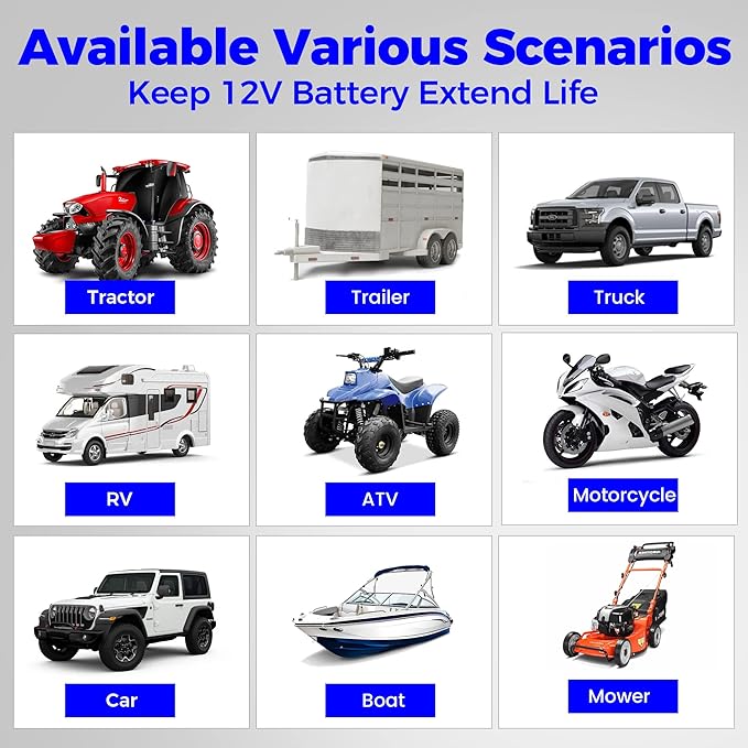 - Versatile Applications: This solar panel kit includes alligator clips and O-rings for easy plug-and-play use. It charges 12V rechargeable batteries like LiFePO₄; lithium; AGM; SLA; GEL; Flooded, and Wet types. Ideal for vehicles; boats; motorcycles; tractors; ATVs; trailers; lawnmowers; RVs; campers; gate openers; pumps, and electric fences