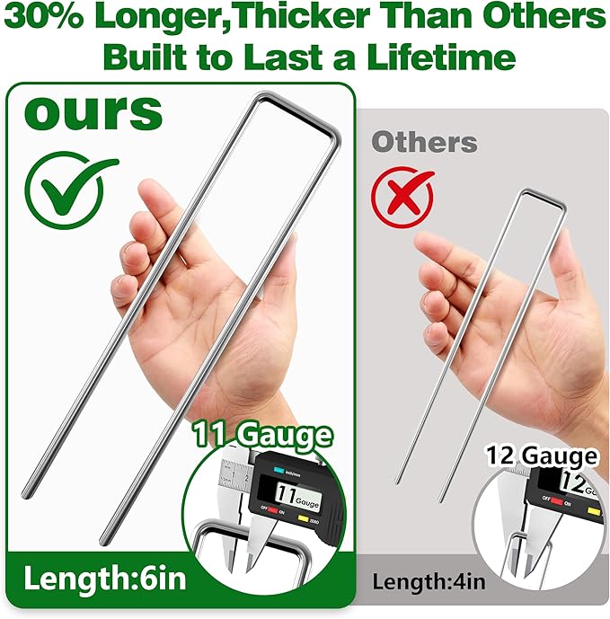 - ๐Material:Our landscape pins are made of heavy-duty hot-dip galvanized steel,11-gauge thickness,30% thicker than ordinary stakes,ensuring they wonโt bend even when hammered into hard soil or gravel.