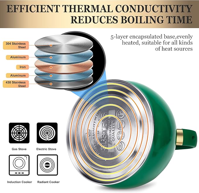 - INNOVATIVE BOTTOM BOILS WATER FASTER - SUSTEAS tea kettle is made of 5 layers encapsulated base, which improves heating performance while reducing heat loss, greatly shortening boiling time. It is compatible with all types of cooktops, including induction, gas, electric, halogen and radiant cooktops. Let you have a premium quality cup of tea or coffee at home