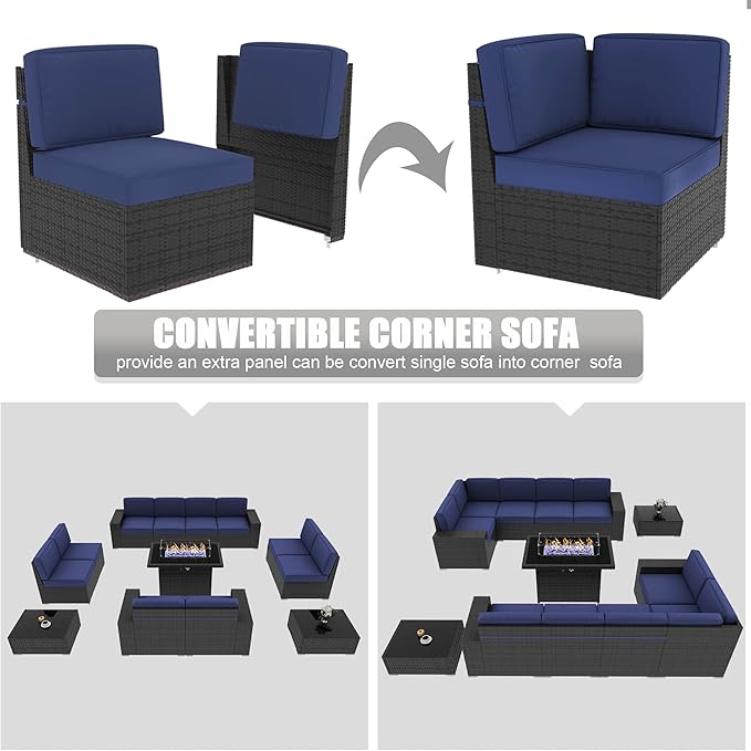 - FLEXIBLE COMBINATION SETTING: 13 pieces outdoor furniture sets come with 2 x Corner Sofas, 4 x Armrest sofa, 4 x Single Sofas, 1 x Fire Pit Table, and 2 x Coffee Table. It allows being pieced together in any combination to suit your needs and match your space