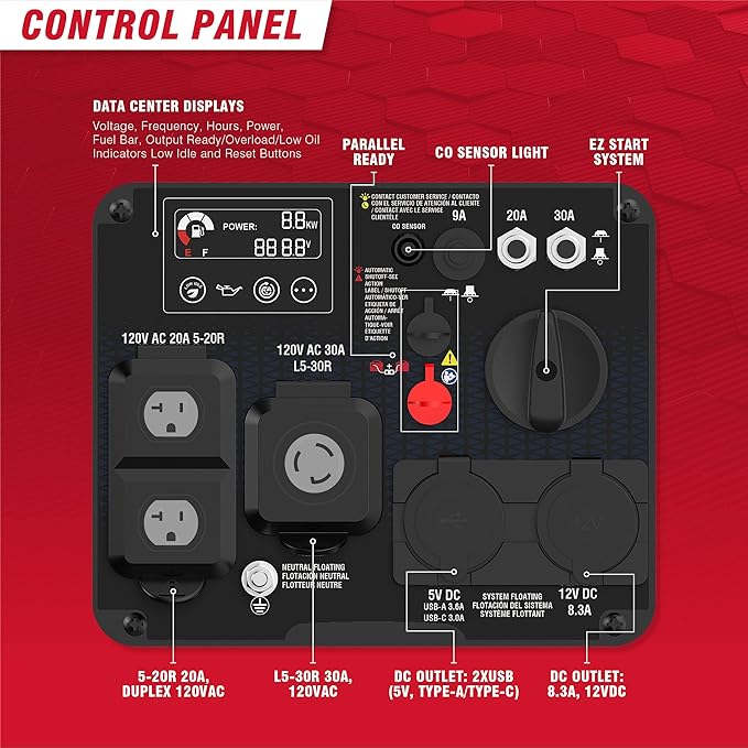 - Multi-Featured Control Panel: The control panel consists of CO sensor indicator light, led light, data center display, 2x USB 5VDC, 1x 8.3A 12VDC, 1x L5-30R 30A 120VAC, 1x Duplex 5-20R 20A 120VAC.