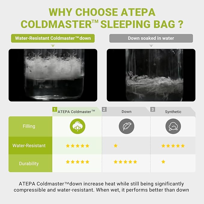 - PREMIUM COLD WEATHER DOWN SLEEPING BAG: Engineered for cold weather, this sleeping bag can keep you comfortable down to 30°F (0°C). It is filled with 600g Coldmaster down (70% down and 30% down alternative synthetic) for exceptional warmth, lightweight and breathability. The insulated design, combined with soft 20D nylon, chest collar, hood drawstring, Windproof strips, velcro, detachable hood and 3D baffle box construction, is designed to prevent cold spots, locks heat even on chilly nights