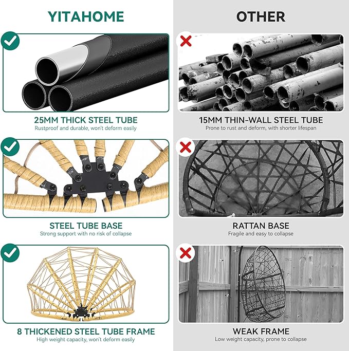 - COMFORTABLE EGG CHAIR WITH STAND: YITAHOME hammock chair used a combination of solid steel frame and rattan to increase strength, have weatherproof and durability, and are equipped with comfortable and soft PP cotton cushion, so that you can enjoy while ensuring your safety