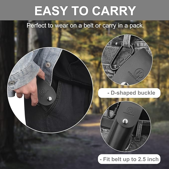 - Leather Sheath: Made of durable thick genuine leather and good stitching, strong snaps are easy on and off. Leather sheath adds protection for the blade and your body. Easy carry under your belt or on a ring on pack when you hiking