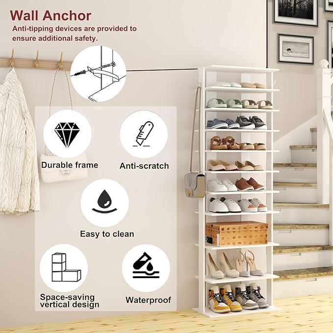 HOMEFORT 10-Tier Corner Shoe Tower - Double Rows, Slim Shoe Stand for 20 Pairs - Entryway, Hallway, Closet (White)