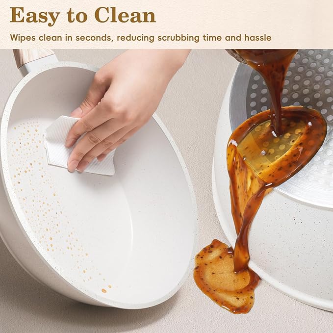 - Easy to Clean – Spend Less Time Scrubbing, More Time Cooking. Simply wipe with a sponge or rinse under water to clean these pans sets—no soaking, no scrubbing, no stress.