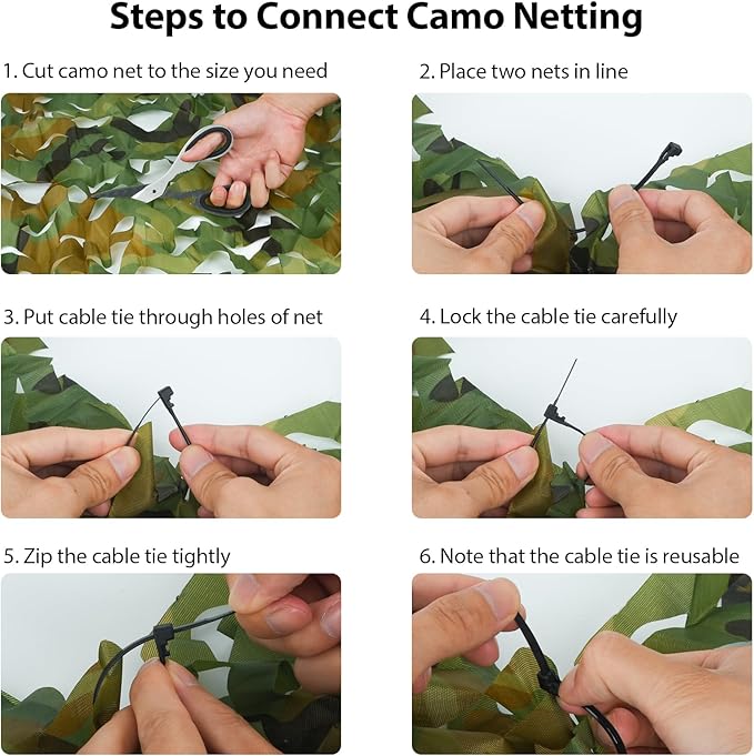 - Free Cutting: Camouflage netting can be easily cut to any size; you can use the included zip ties to fix it. Camo net can match with a variety of background colors, so you can observe the surrounding terrain well, providing maximum concealment in the field
