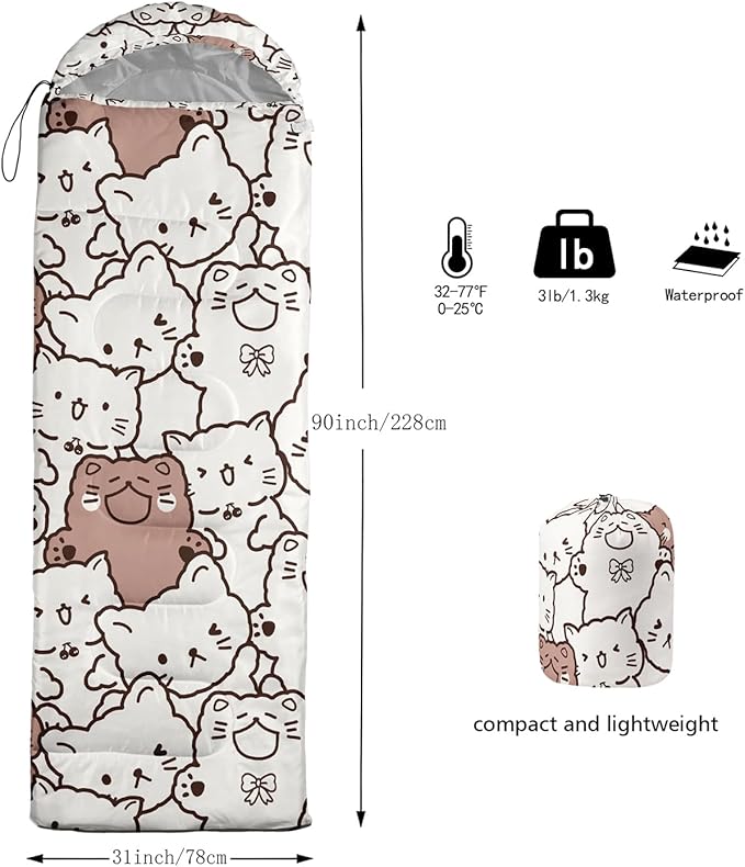 - ๐ใFashion DesignใSIZE - 31 by 90 inches (W x D). Our sleeping bag can be used in 3 seasons with a design temperature of 32โ-77โ(0โ-25โ). These bags also have a weather resistant waterproof design to keep you warm and prevent you from any dampness.