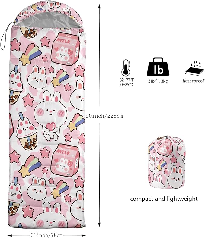 - ๐ใFashion DesignใSIZE - 31 by 90 inches (W x D). Our sleeping bag can be used in 3 seasons with a design temperature of 32โ-77โ(0โ-25โ). These bags also have a weather resistant waterproof design to keep you warm and prevent you from any dampness.