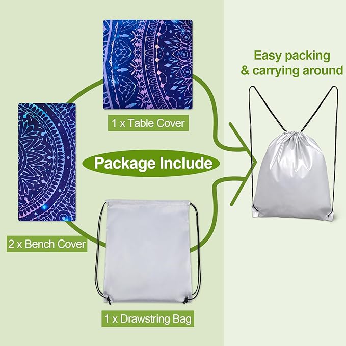 - 【PACKAGE INCLUDE】Suitable for Standard 8FT Table and Bench. The camping tablecloth 3 pcs set include 1 x picnic table cover, 2 x bench covers, fitted for 96"x 30" rectangle tables and 96"x 12" benches. Package additional include a drawstring bag for easy storage and carring around, practical for camping, picnic, barbeque and other outdoor activities.