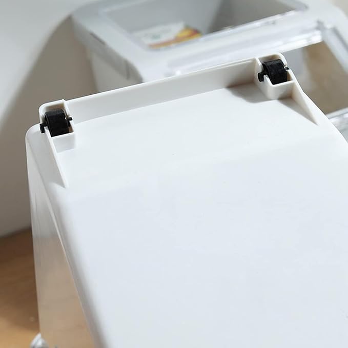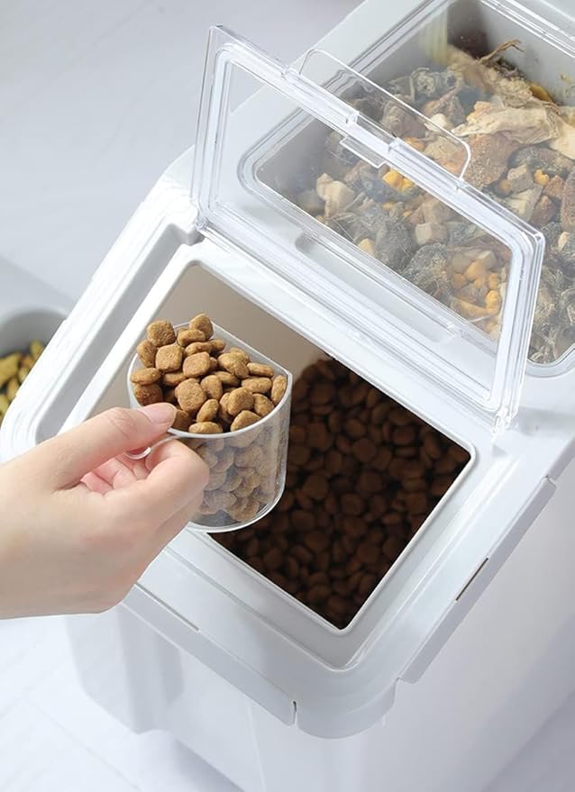 - ๐๐ฟ๐ถ๐ฒ๐ป๐ฑ๐น๐ & ๐๐ผ๐ป๐๐ฒ๐ป๐ถ๐ฒ๐ป๐ฐ๐ฒ: The transparent flip design of the dog food container allows you to observe the remaining amount of food and remind you to replenish it in time. And there are two rollers at the bottom, which can be moved easily by pushing and pulling through the recessed handle.