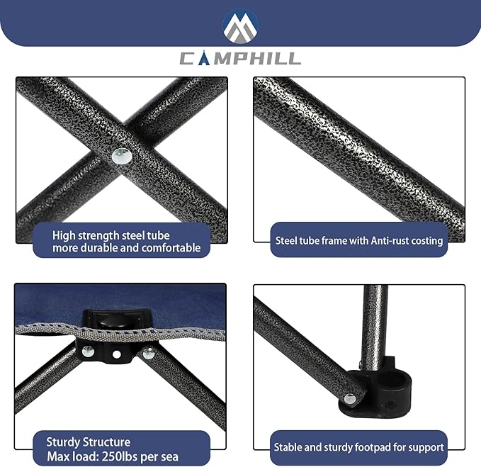 - 【Sturdy and Durable】:Camphill camping chair set is built with a heavy-duty powder coated steel frame. The sofa supports 500 lbs. (250 lbs each side) and measures 35”H, 37.4”L, 19.3”D (open). The chair supports 300 lbs. and measures 35”H, 19”L, 19”D (open).Oversized camping chair set is designed to provide ample space for relaxation.