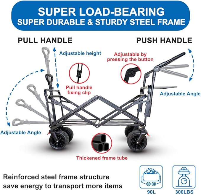 - ๐Foldable Wagon with Big Wheels: The large wide all terrain wheels suit different road surfaces, such as mud, sand, gravel roads,etc. The front wheels can rotate 360 degrees, easy to go ahead and turn around. Also, Pull and push handles are adjustable for different heights of people. Whichever direction you want to go, you'll have no trouble wheeling this cart around.