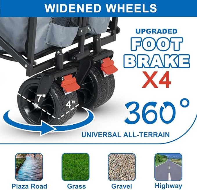 - ๐Stable & Safe Foldable Wagons: 360ยฐ universal 4" widened and 7" diameter large all-terrain wheels, no matter on the beach, grass, gravel road or bad road conditions, it can drive stably and bring you a more comfortable experience. Equipped with 4 foot brakes, it can help us control the cart more easily and keep the stability of the cart, improving the safety of us.