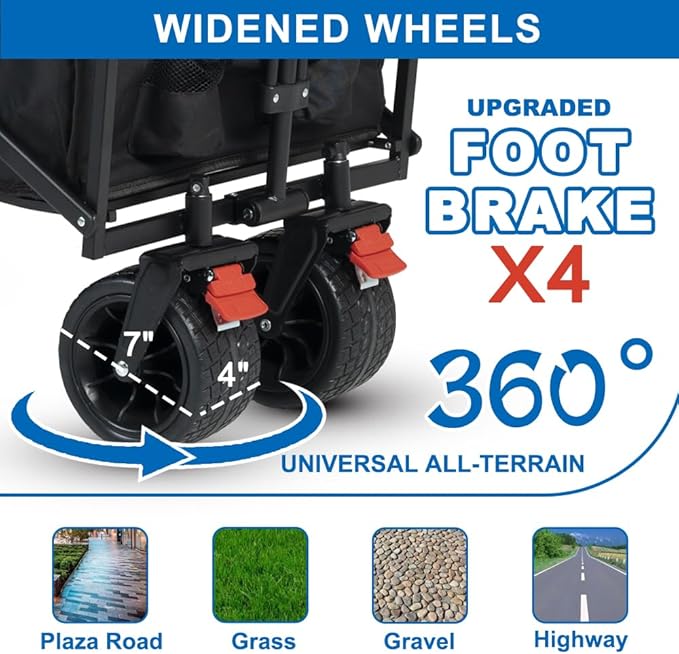 - ๐Stable & Safe Foldable Wagons: 360ยฐ universal 4" widened and 7" diameter large all-terrain wheels, no matter on the beach, grass, gravel road or bad road conditions, it can drive stably and bring you a more comfortable experience. Equipped with 4 foot brakes, it can help us control the cart more easily and keep the stability of the cart, improving the safety of us.