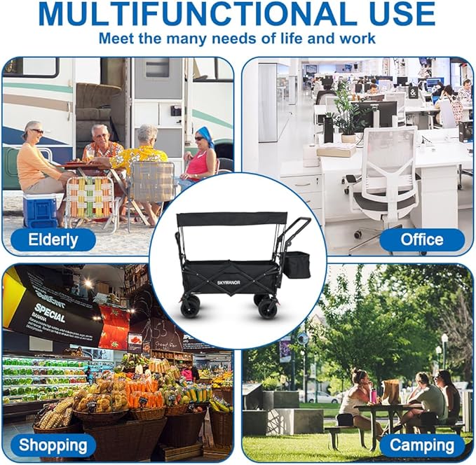 - ๐Multipurpose Wagon Cart: Equipped with UV shield and safety belt, it can protect our children or items from the sun. Whether it is outdoors or indoors, we can use this stroller with confidence. This stroller is not only suitable for daily family use such as taking children and shopping, but also for travel, camping, garden, barbecues, office and many other occasions, making your life more colorful.