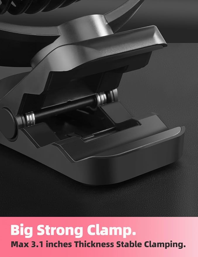 - 【720°Rotation & Timing Function】This fan clip can be placed very securely or clamped anywhere you want, The portable clip on fan has a nimble head that can rotate 360°degrees vertically and horizontally, so you can stay cool from any angle perfectly. Meanwhile, The Battery desk fan has 360-degree adjustable rotation—no need to stand up or stretch out your arms to adjust the fan. Set the timer function to turn off after 1 hour/3 hours/5 hours automatically.