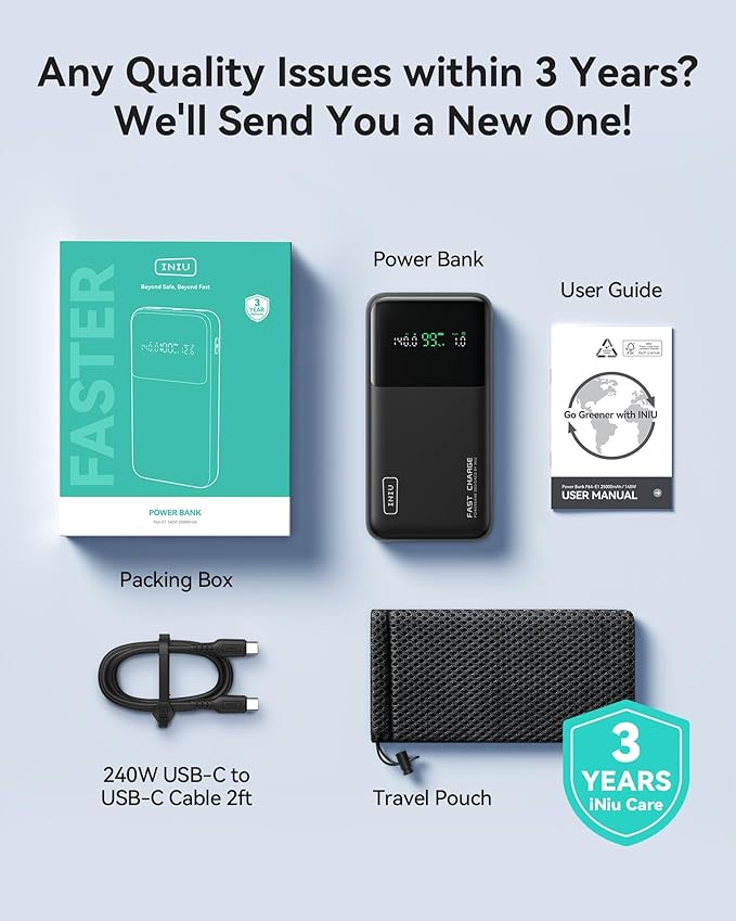 - What You Get: INIU 25000mAh Power Bank*1, 240W USB-C to USB-C Cable 2ft*1, Welcome Guide*1, Industry-leading 3-year iNiu care, and lifetime technical support.