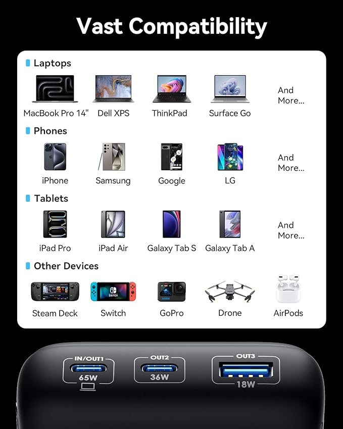 - [Charge 3 at Once] With 3 charging ports, including a blazing-fast PD 65W USB-C out port, a PD 36W USB-C fast charging port, and a trusty USB-A port, this power bank is your all-in-one charging solution. It works seamlessly with various cable types, ensuring rapid charging for all your devices.